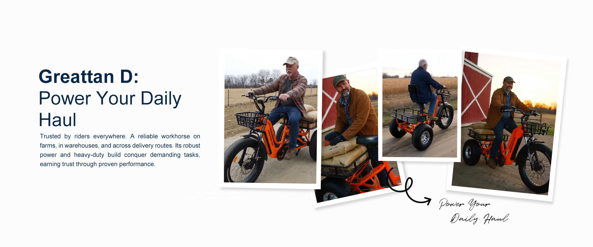 The Greattan D elevates this capability even further. Its long‑range dual‑battery system eliminates mid‑shift charging, while the 500‑lb payload capacity supports high‑volume parcel loads throughout the day. Delivery riders benefit from the stable three‑wheel platform, which allows rapid loading and unloading without balancing concerns—critical during frequent stop‑and‑go operations. This makes the Greattan D especially valuable for food‑delivery services and courier/express logistics, where fast turnaround, high payload capacity, and all‑day reliability directly impact delivery efficiency and customer satisfaction.